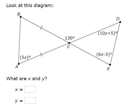 From the diagram, we know that there are two congruent legs of the triangle on the left (indicated by the lines). This means that two angles in this triangle measure 5x degrees. Because the third angle of the triangle is supplementary to the 130 degree angle, we know it must measure (180-130) or 50 degrees. We can apply this supplementary argument to the triangle on the right as well. Looking at both triangles, we can create the following equations using the idea that the interior angles of a triangle must add to 180 degrees total. This gives us the following equations:
