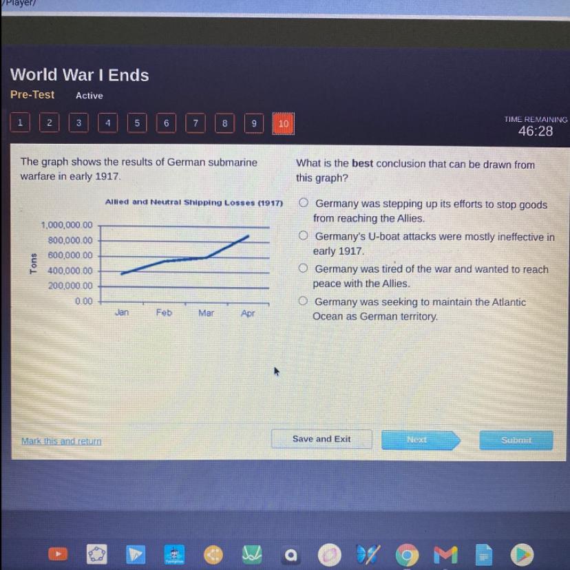 The graph is titled "Allied and Neutral Shipping Losses," and since the line is increasing, this means Germany was steeping up its efforts to stop goods from reaching their allies.