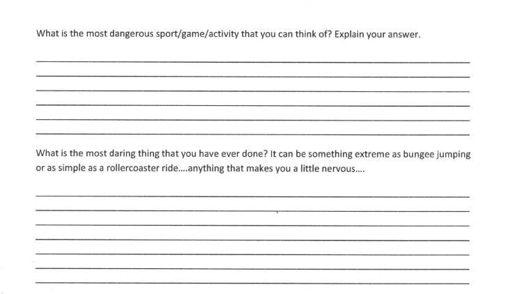 For the second one, just answer what the most dangerous or exciting thing you have ever done, even if it’s just something as like jumping out of a tree. That’s personal experience, nothing anyone can help you with.
