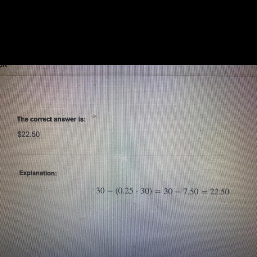 75% = 30 - 7.50 = 22.50 or 0.30 x 75 = 22.50 (Both solutions give the same answer)