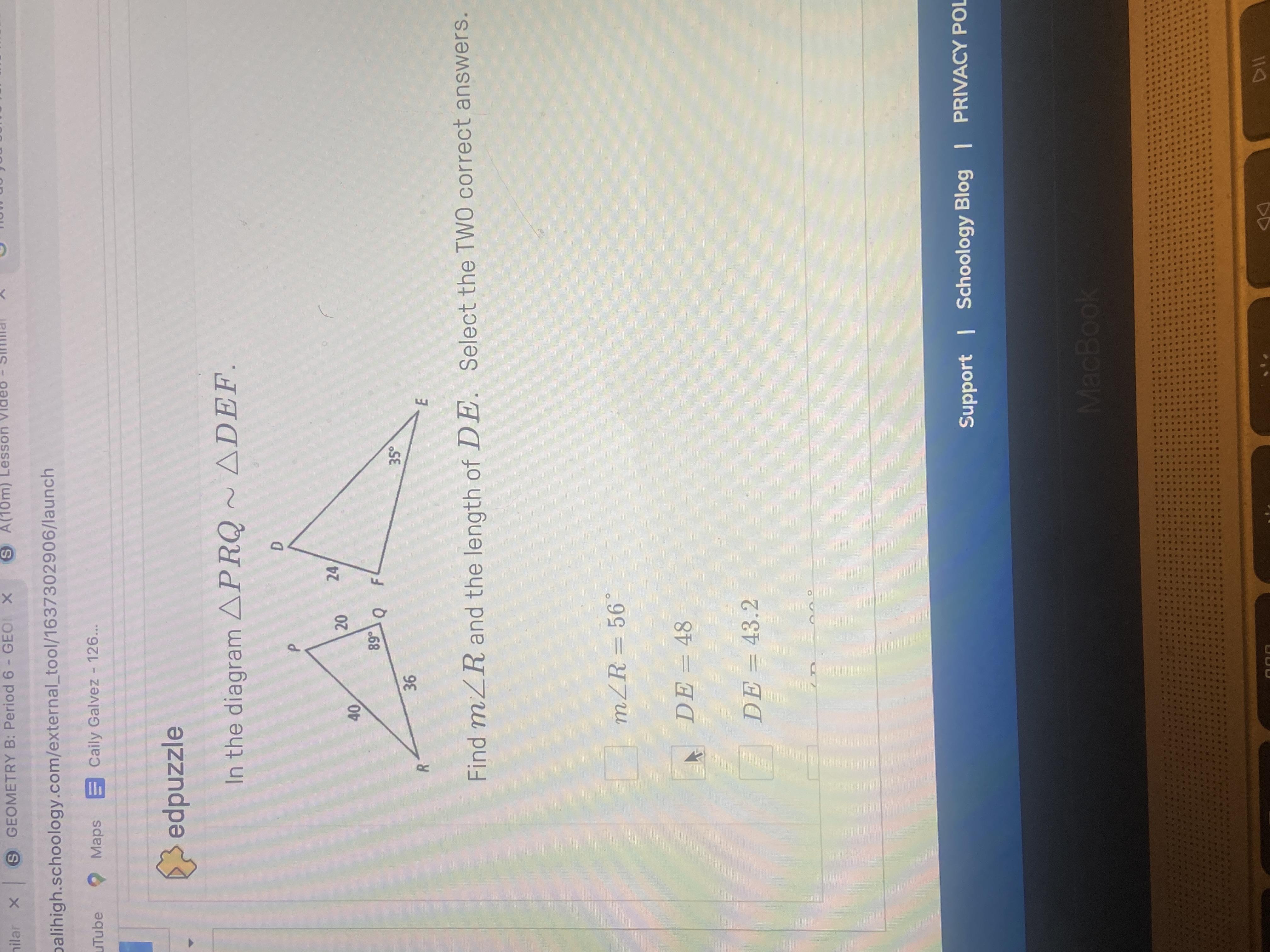 Angle R is equal to 35 and DE is equal to 48