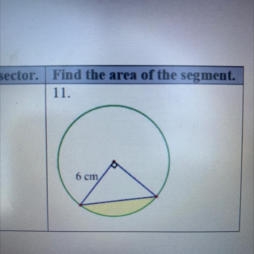 Now you must find the area of the triangle with side length 6. Remember, this is an isosceles triangle with sides length of 6 because two of the sides are radii. Also, remember that this is a 90 degree triangle, so the area of the triangle is simply