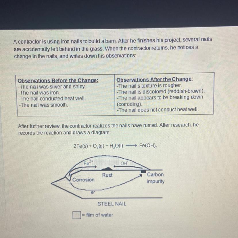 Also, the change in the physical appearance of the nail from a shinning metal to reddish brown indicates that a chemical change has occurred.
