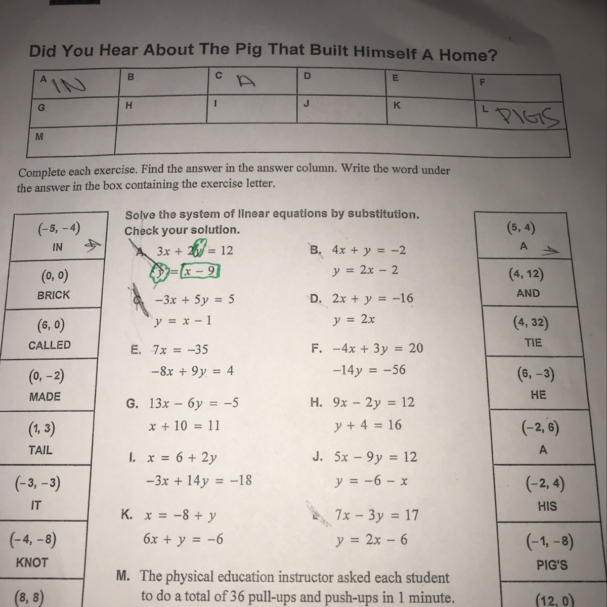 The physical education instructor asked each student to do a total of 36 pull-ups and push-ups in 1 minute. The instructor wanted students to do 8 times as many push-ups as pull-ups. Write a system of linear equations that represents this situation. How many pull-ups and push-ups were required in 1 minute?