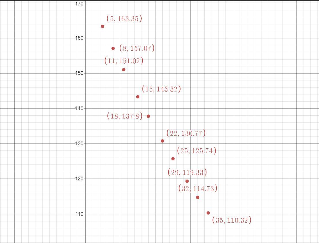 (5,163.35),(8,157.07),(11,151.02),(15.143.32)(18,137.800),(22,130.77),(25,125.74),(29,119.33),(32,114.73),(35,110.32)