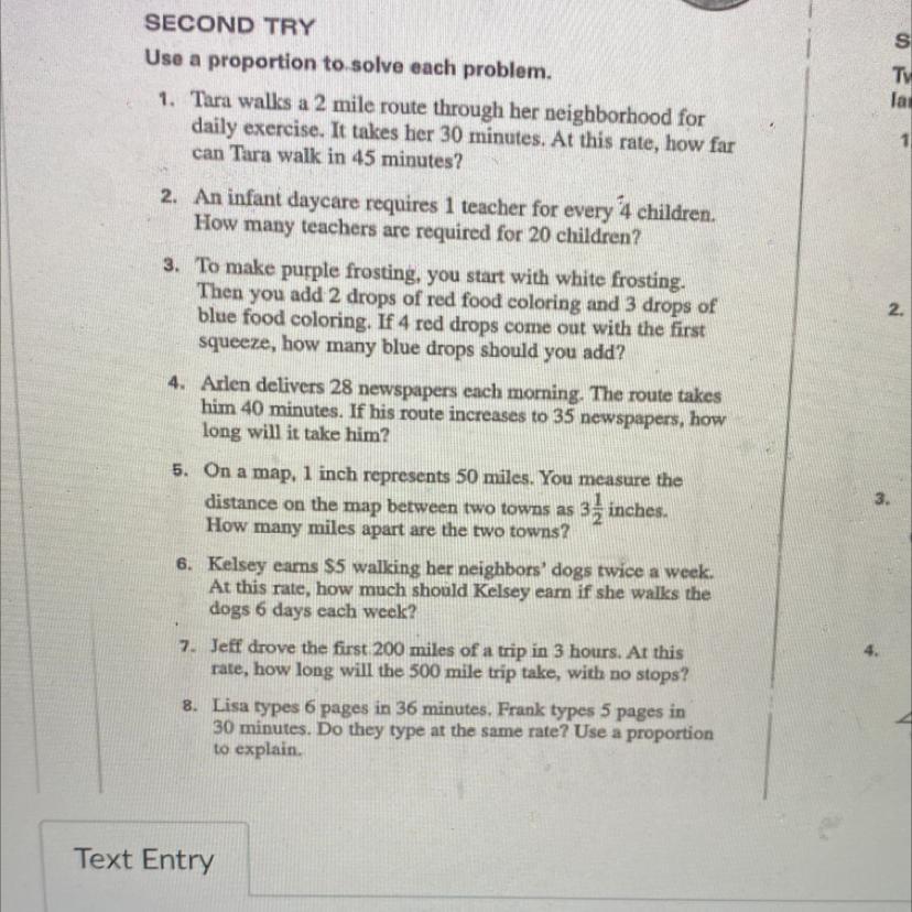1. Tara walks a 2 mile route through her neighborhood for daily exercise. It takes her 30 minutes. At this rate, how far can Tara walk in 45 minutes?
