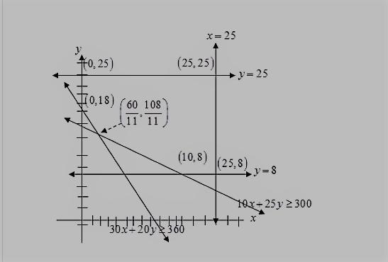 NOW, the corner points (0,18),(0,25),(25,25), and (25,8) can be calculated from the graph. From the diagram, the corner point