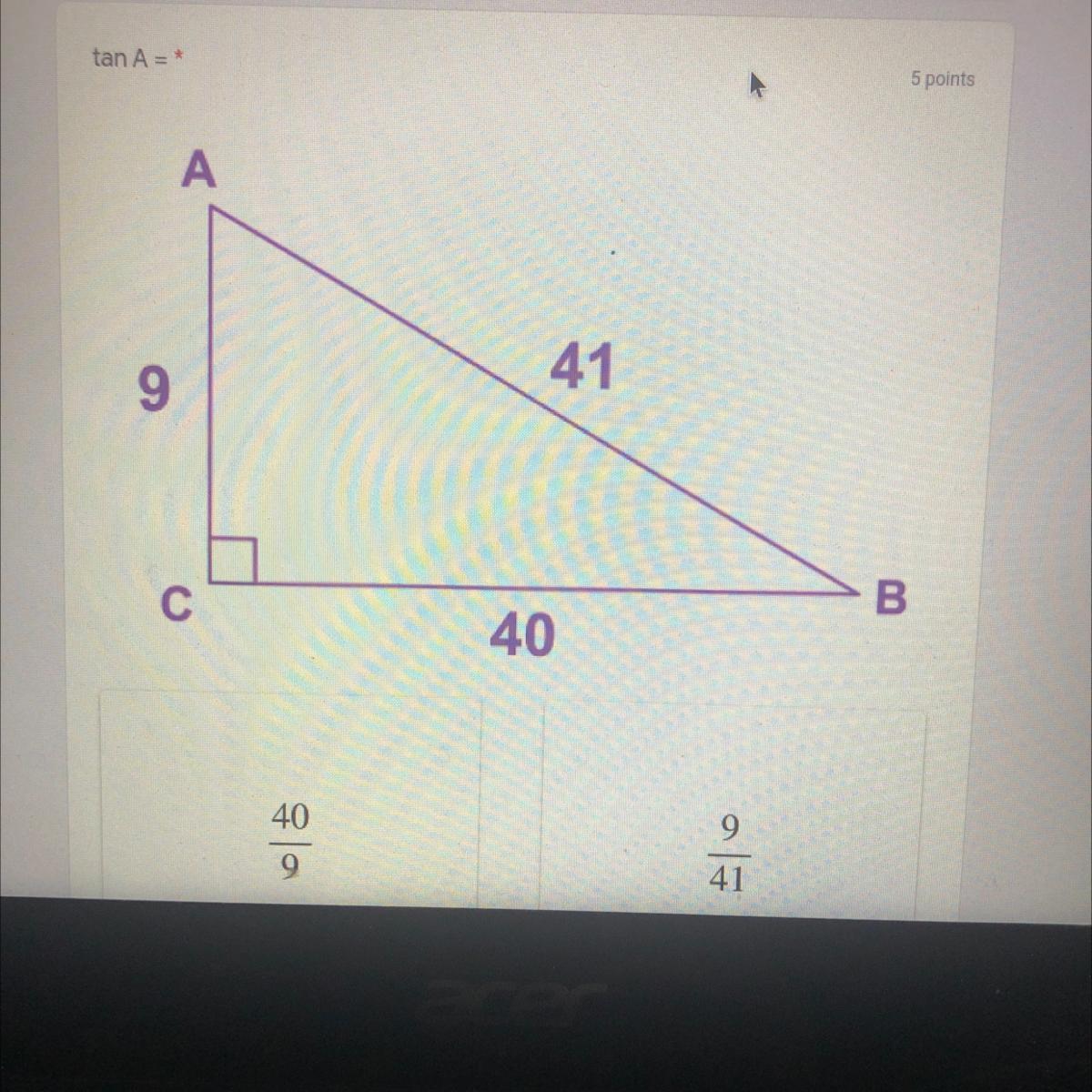 tan A = BC/AC = 40/9
