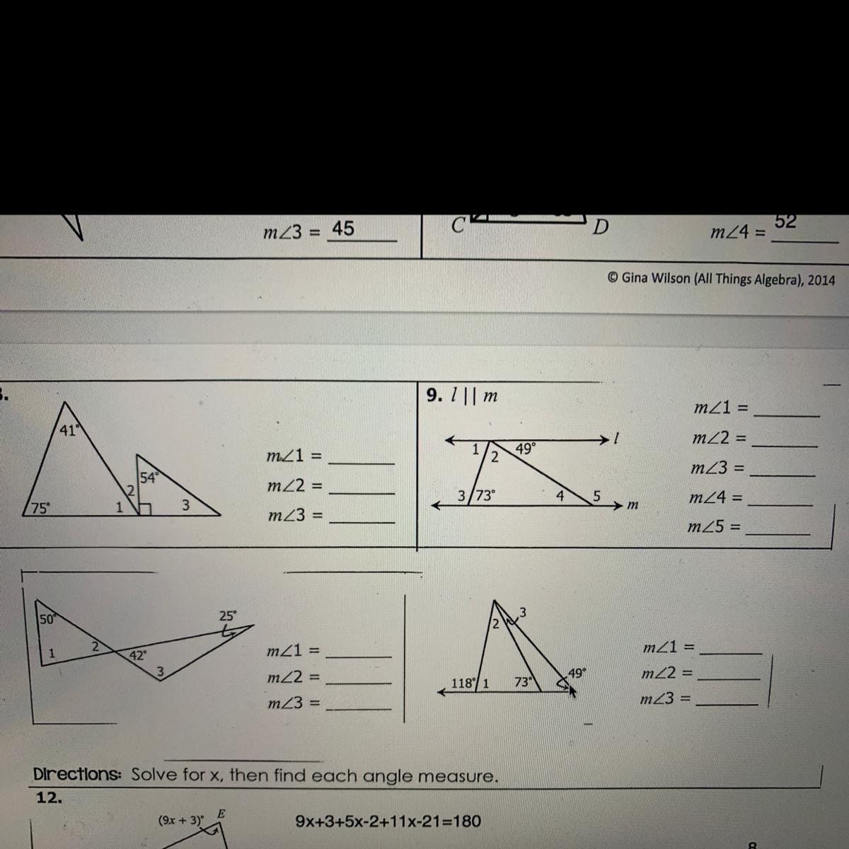 So for a hint to help you...when you are looking at a triangle on a 180 degree line, each angle adds up to 180 degrees. So for example, on #9 on the top of the triangle, one of the angles is 49 degrees so you want to subtract that from 180 ( 180 - 49 = X ) ( X = angle 1 and 2 ) so angle 1 and 2 added together equals X. In this case, ( X = 131 degrees ) Every triangle equals 180 degrees too. So since this angle has 3 different angles on the line, you can do the rest of the problems and come back to these because you can subtract angle 4 and 73 to get angle 2.