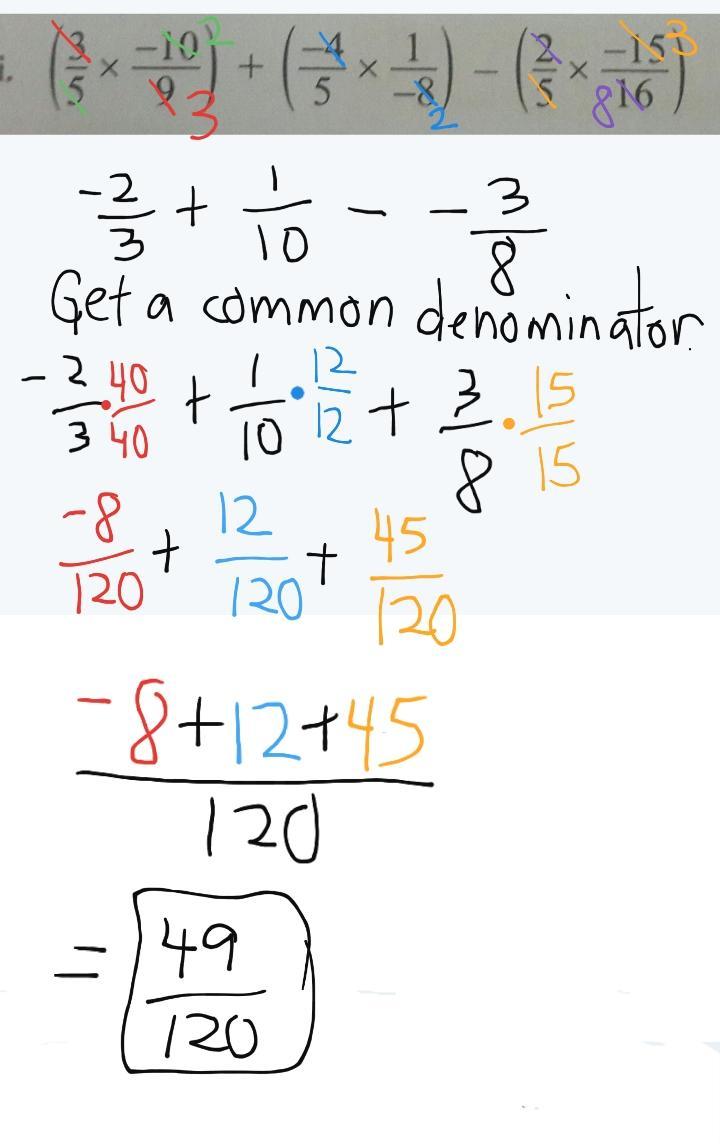 Simplify first. Then get a common denominator, this is 120 in this case. 120 is the smallest number that all the denominators (3 and 8 and 10) go into. To add fractions, add all the top numbers (numerators). Keep the same denominator. see image.