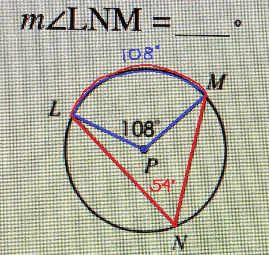 Since we know that the central angle is 108°, with what we know about central angles we know that arc LM is going to be 108° as well.