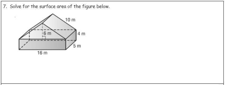 To find the surface area, we have to find the area of all the faces of the shape, then add them together. We also only use the exposed faces, or the faces on the outside, not the inside.