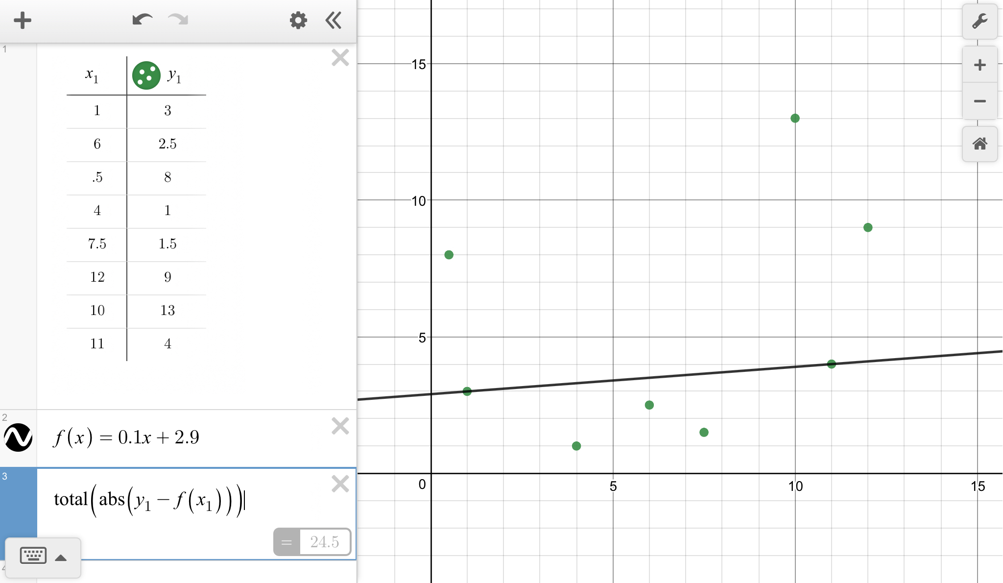 You add up the magnitudes of the differences between the given y-value and the corresponding value you get from the equation. For the first couple of points, these values are ...