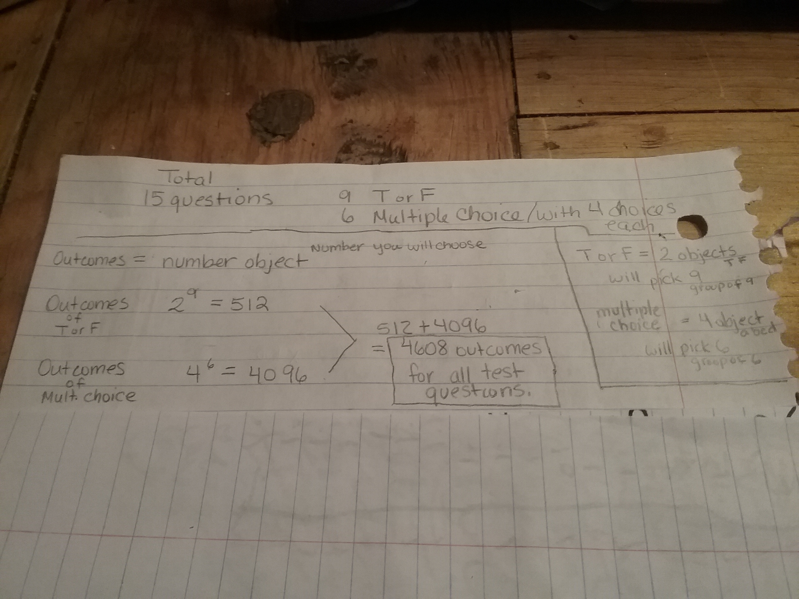 A test consists of 15 questions. 9 are true-false questions, and 6 are multiple-choice questions that have four choices each. a