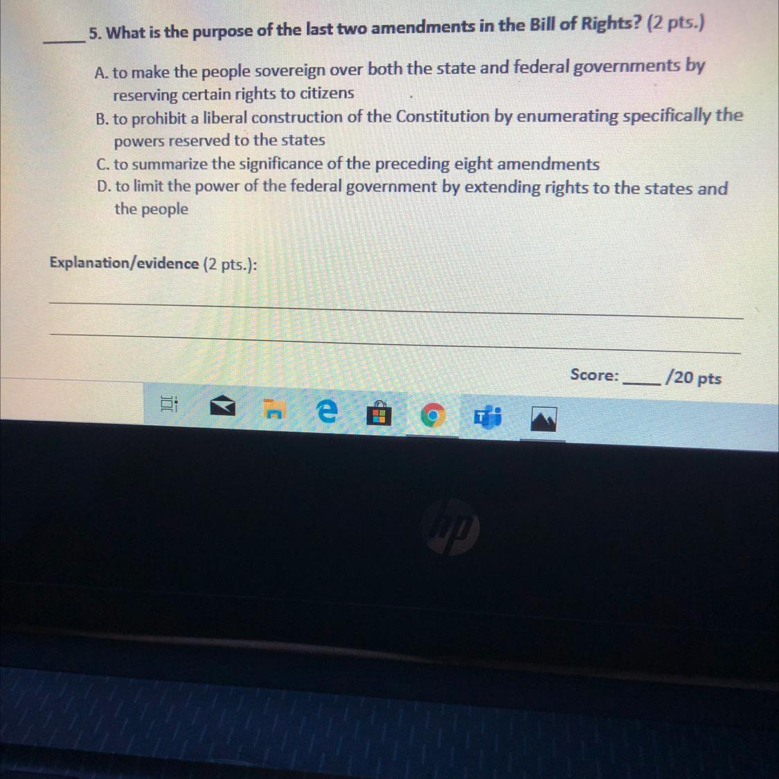 The correct answer is A. The purpose of the last two amendments in the Bill of Rights is to make the people sovereign over both the state and federal governments by reserving certain rights to citizens.