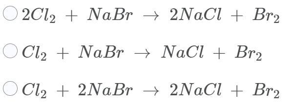 Cl2 + 2NaBr —> 2NaCl + Br2