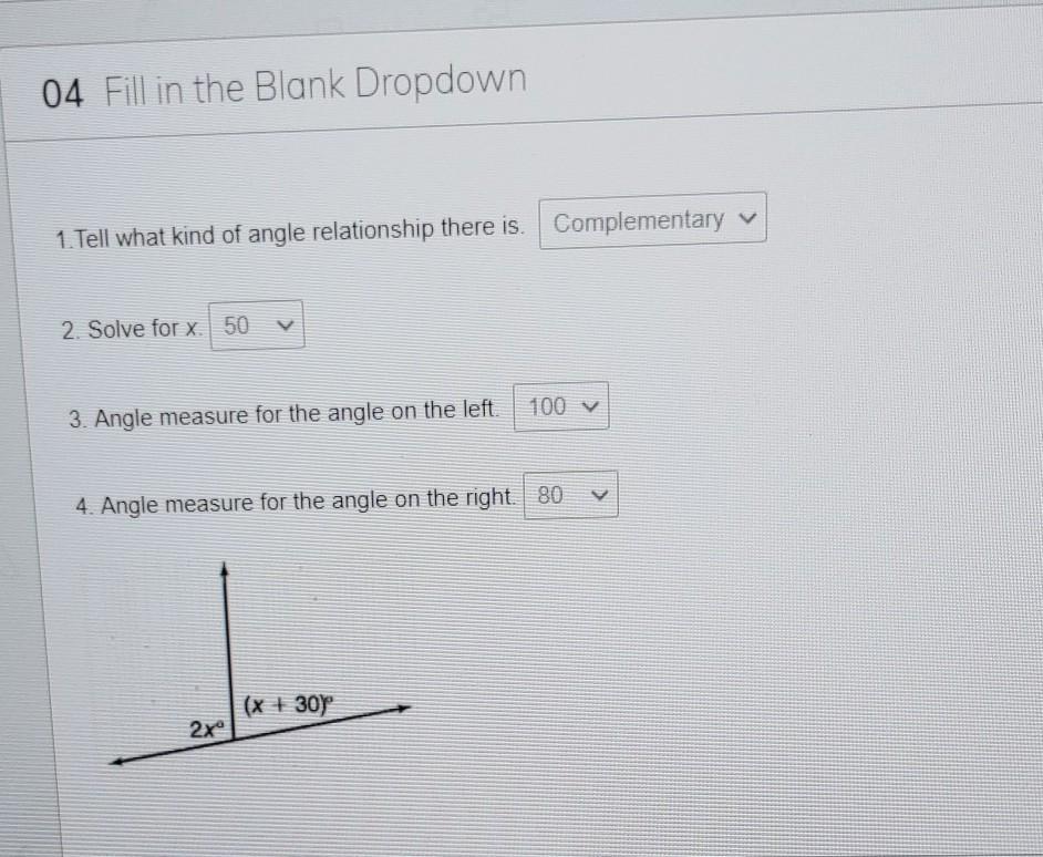 2. The image shows a linear pair of angles. On the left side, the angle measures 2x, on the right side, the angle measures x+30. Since the sum is 180°: