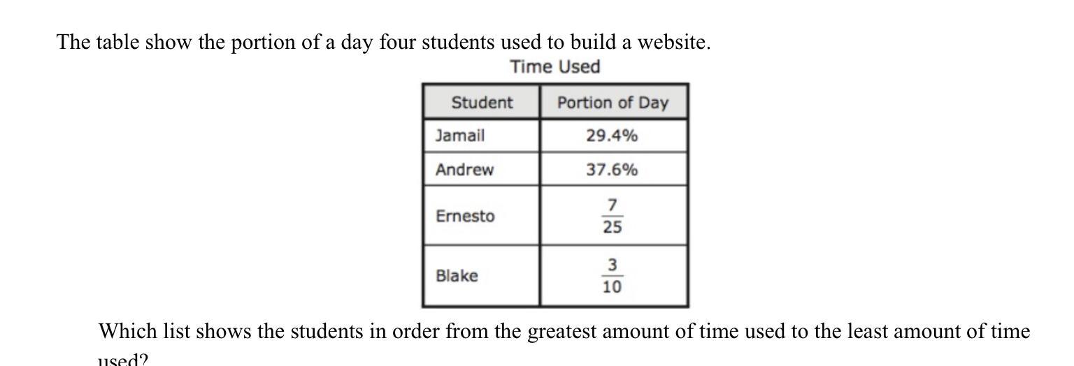 You need the numbers to all be the same kind (ie. fractions or percentages) since there are more percentages, I decided to convert the fractions to percentages. This means that the denominators need to be 100. So, if we take Blake which is 3/10, than converting it to a percentage is easy. If you add a zero to both the numerator and the denominator, than you get 30/100 or 30%. For Ernesto, (7/25) multiply the numerator and the denominator by 4 to get 28/100 or 28%. Then, order them: 37.6%, 30%, 29.4% and 28% Hope this helps!