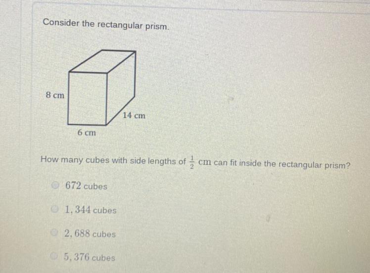 672 cubes because 8×6×14 equals 672 I hope it helps