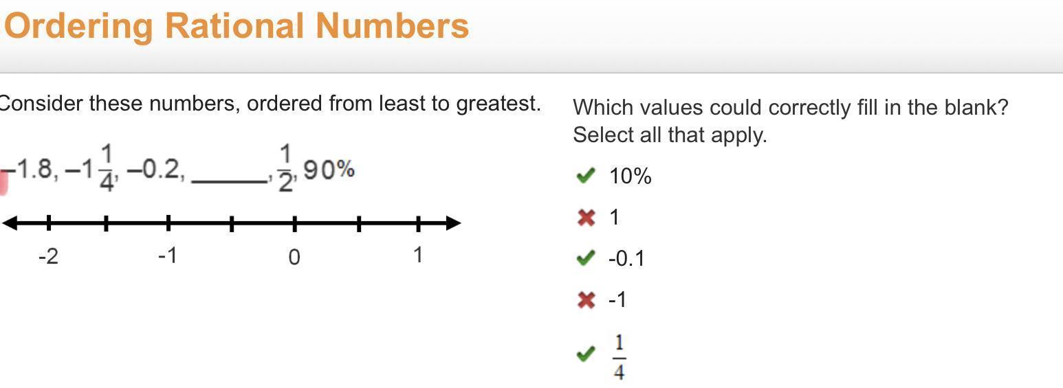 Consider these numbers, ordered from least to greatest. Negative 1.8, negative 1 and one-fourth, negative 0.2, blank, one-half, 90 percent A number line going from negative 2 to positive 1. Which values could correctly fill in the blank? Select all that apply. 10% 1 -0.1 -1 One-fourth