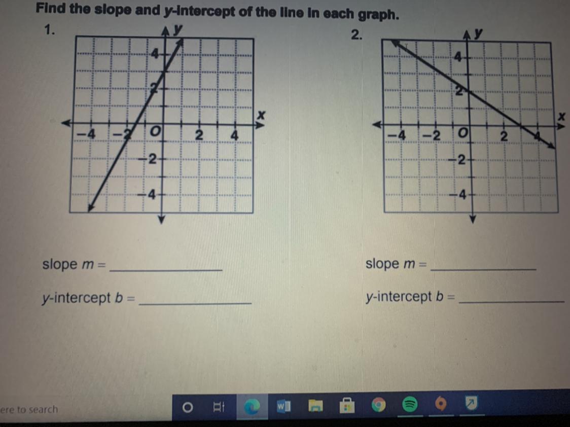 2. slope = \frac{-2}{3}; y-intercept = 2