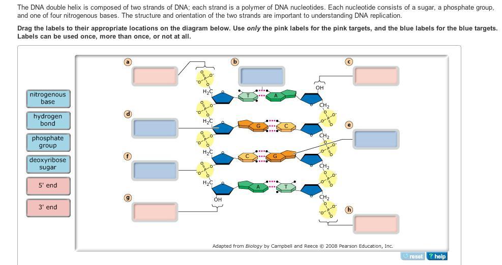 - a nitrogenous base (present in the middle of the DNA double helix, orange and green)