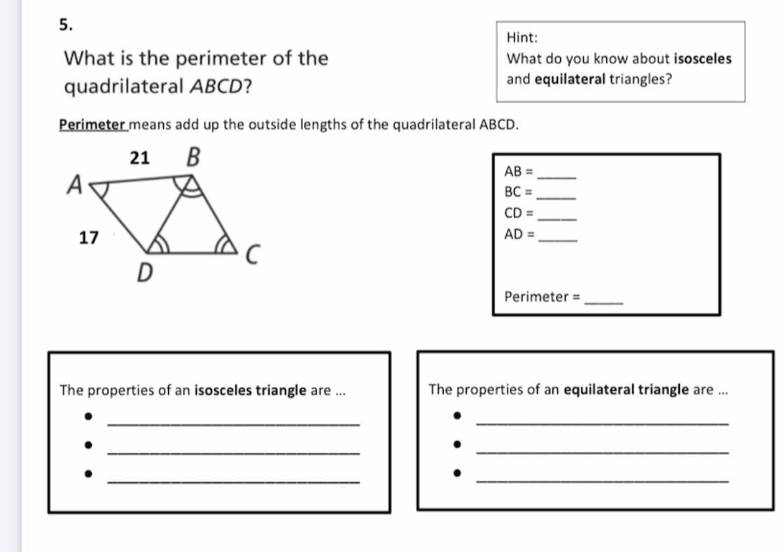 Before we add up he outside lengths of Quadrilateral ABCD to find the perimeter, let's recall three properties of each triangle: