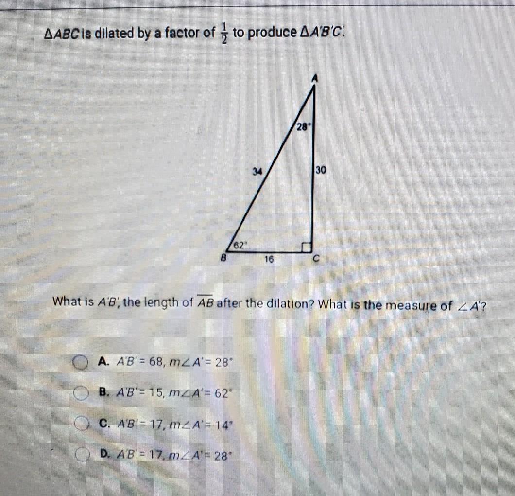 4? A. AB = 68, MZA= 28" B. AB'= 15, mZA= 62 C. ABP = 17, m.ZA'= 14° D. A'B'= 17, mAA'= 28​.