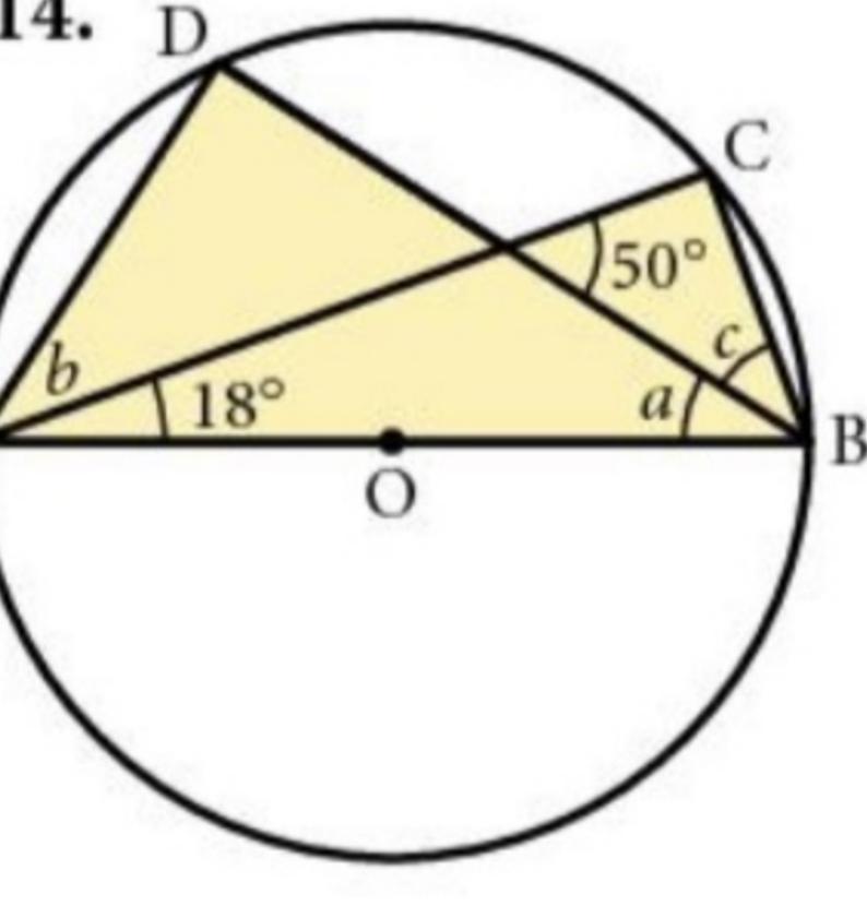 <em>to </em><em>find</em><em> </em><em>b </em><em>you </em><em>must </em><em>know </em><em>that </em><em>the </em><em>angle </em><em>at </em><em>the </em><em>center</em><em> is</em><em> </em><em>twice</em><em> </em><em>the </em><em>angle </em><em>at </em><em>the </em><em>circumference</em><em> </em><em>meaning</em><em> </em><em>the </em><em>large</em><em> </em><em>angle </em><em>C </em><em>is </em><em>9</em><em>0</em><em>°</em><em>,</em><em>now </em><em>if </em><em>it's</em><em> </em><em>9</em><em>0</em><em>°</em><em> </em><em>inorder </em><em>to </em><em>find</em><em> </em><em>the </em><em>big </em><em>angle </em><em>B </em><em>you </em><em>must </em><em>add </em><em>the </em><em>1</em><em>8</em><em>+</em><em>9</em><em>0</em><em> </em><em>then </em><em>subtract</em><em> </em><em>1</em><em>8</em><em>0</em>