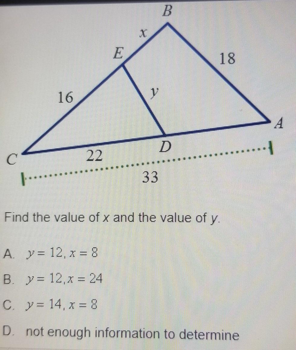 No relationship is shown between the sides of triangle CDE and triangle ABC. There is not enough information to make any claim regarding side lengths x or y.