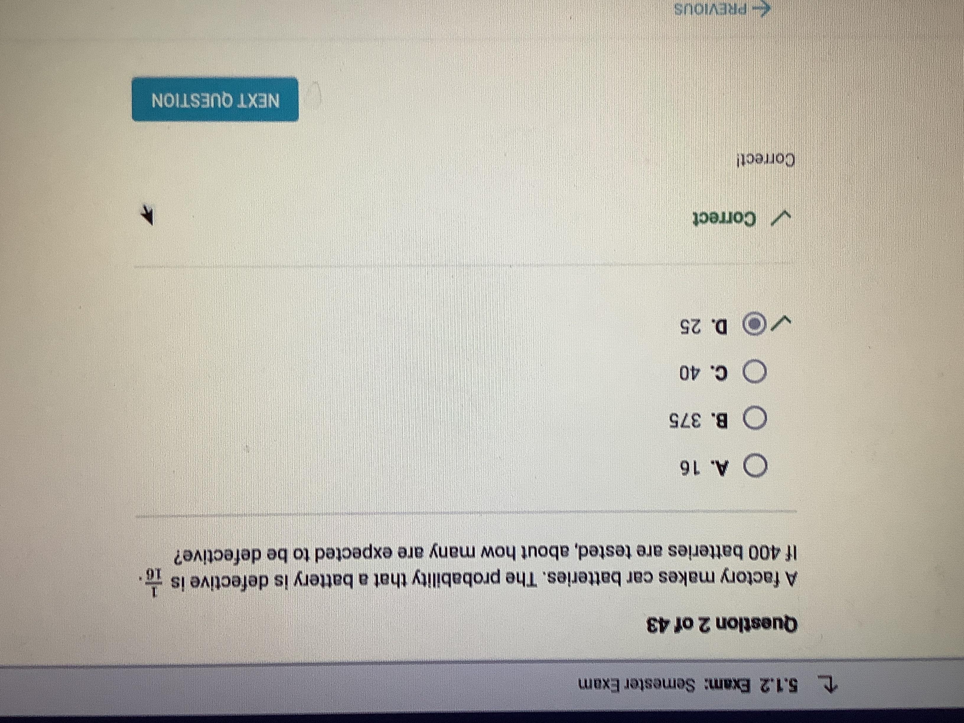 a factory makes car batteries. the probability that a batterie is defective is 1/16. if 400 batteries are tested, about how many
