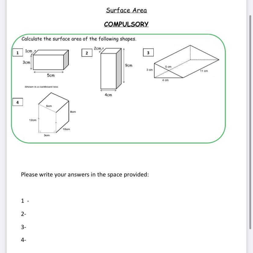 4) lets work out the easy ones first using the same formula from question 1 for one surface area but this is a trapezium, which is a irregular quadratical shape so the sides would most liky be different from each other except the front and back.