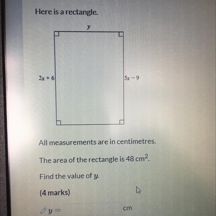 Here is a rectangle all measurement are in centimetres the area is 48cm^2 find the value of y