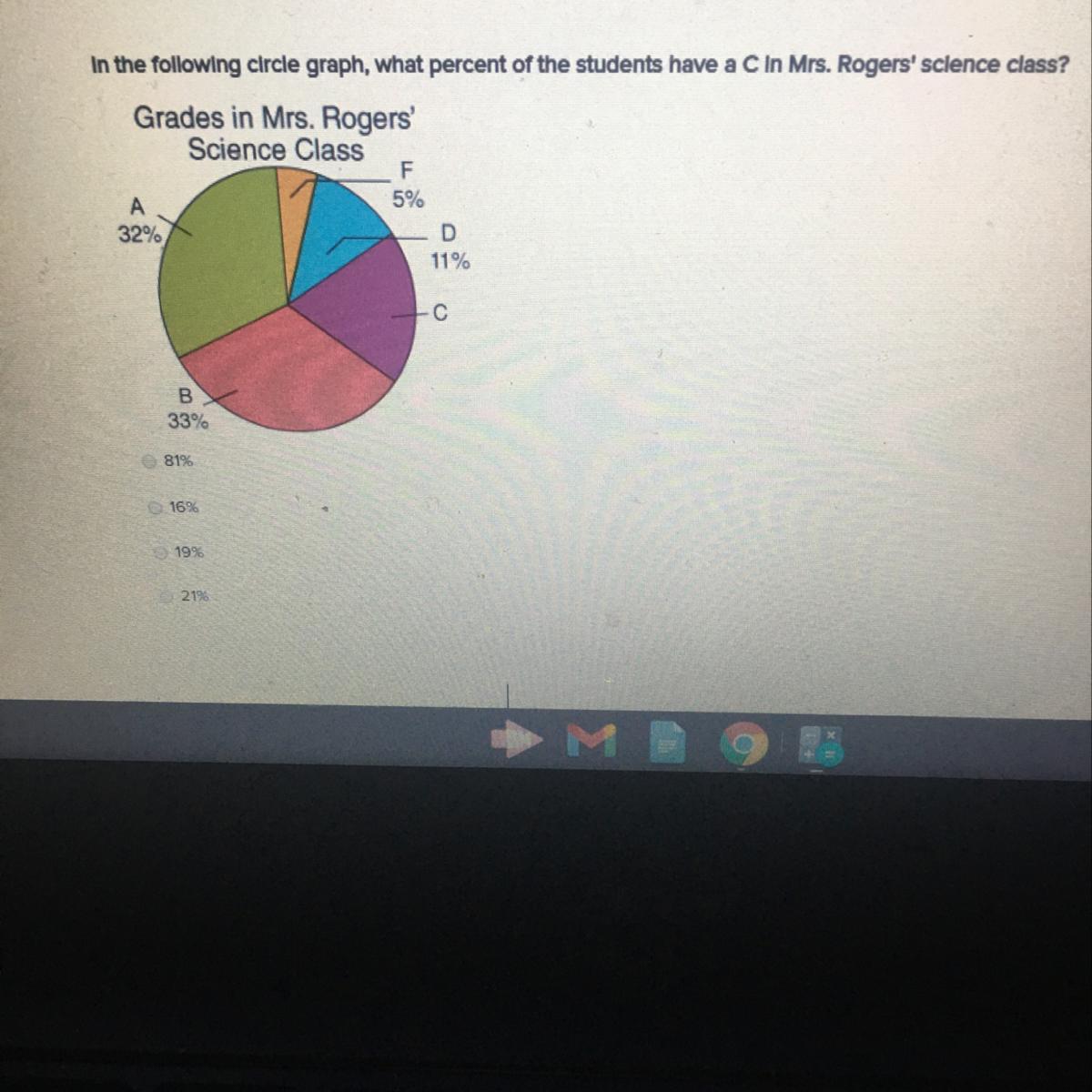 In Miss Rogers science class, 32%, 33%, 11%, 5% of students have A, B, D, F respectively.