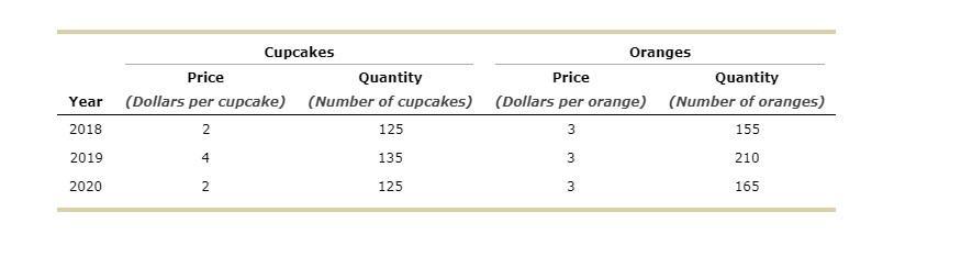 Consider a simple economy that produces two goods: cupcakes and oranges. The following table shows the prices and quantities of