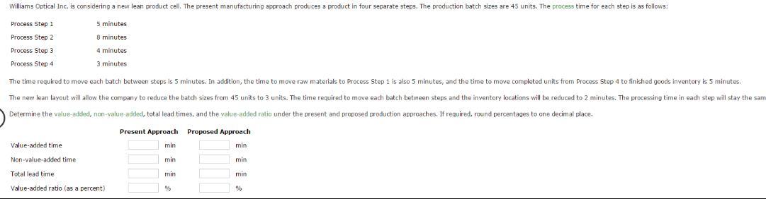 Williams Optical Inc. is considering a new lean product cell. The present manufacturing approach produces a product in four sepa