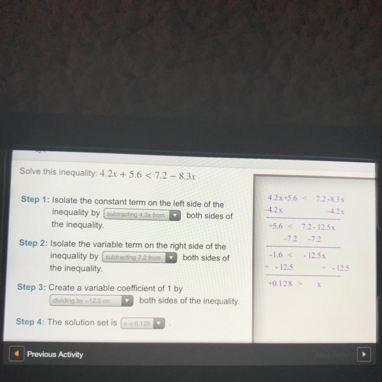 subtracting 4.2x, subtracting 7.2, dividing by –12.5, x < 0.128.