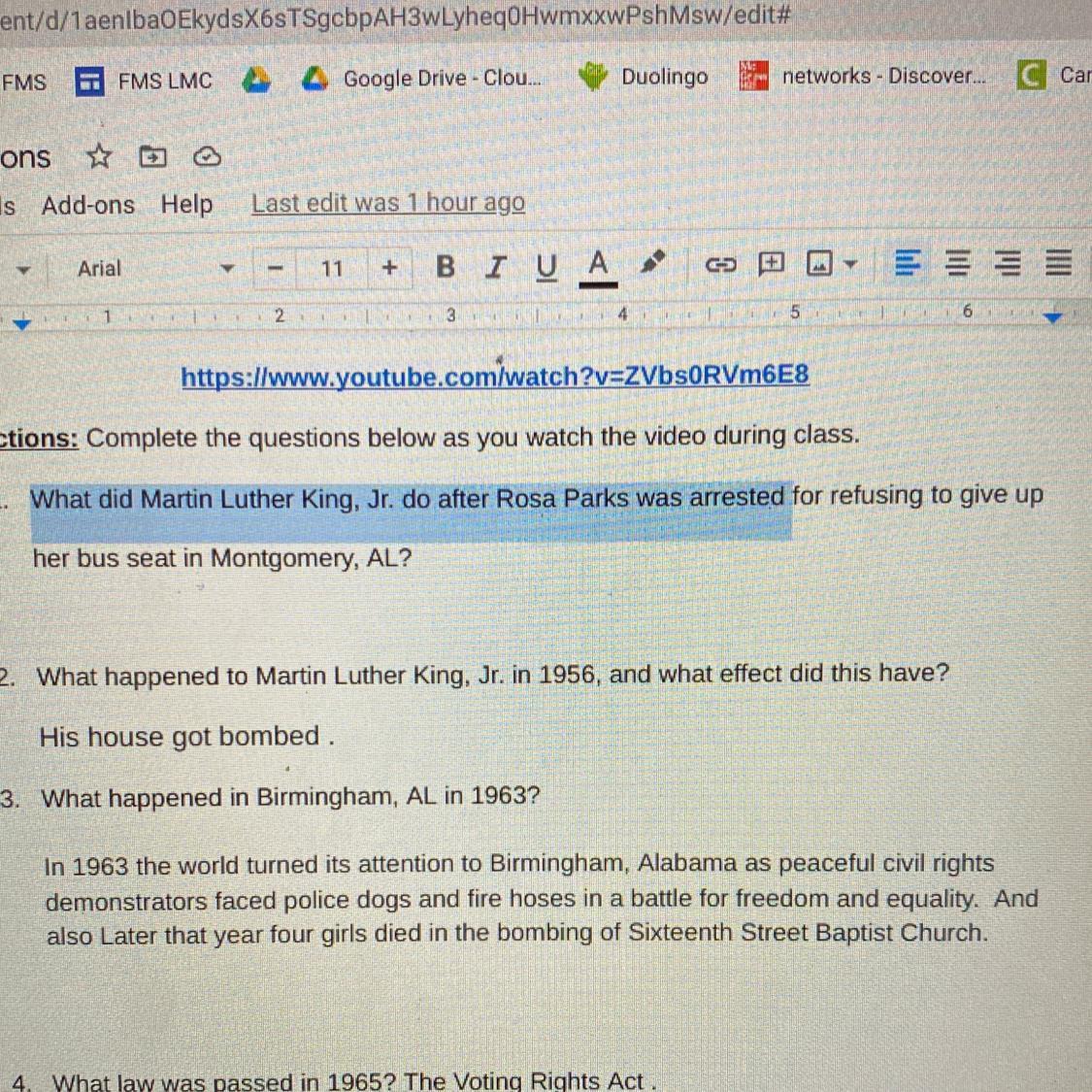 Q1: In Montgomery, Alabama, Rosa Parks is jailed for refusing to give up her seat on a public bus to a white man, a violation of the city's racial segregation laws. The successful Montgomery Bus Boycott, organized by a young Baptist minister named Martin Luther King, Jr., followed Park's historic act of civil disobedience.