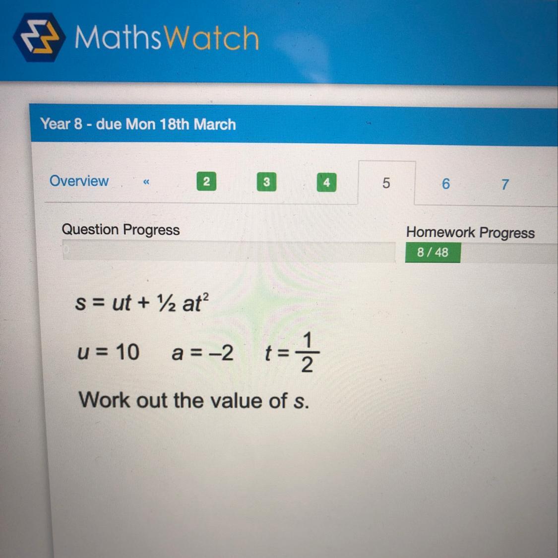 s = (10)(1/2) + 1/2 (-2)(1/2)^2