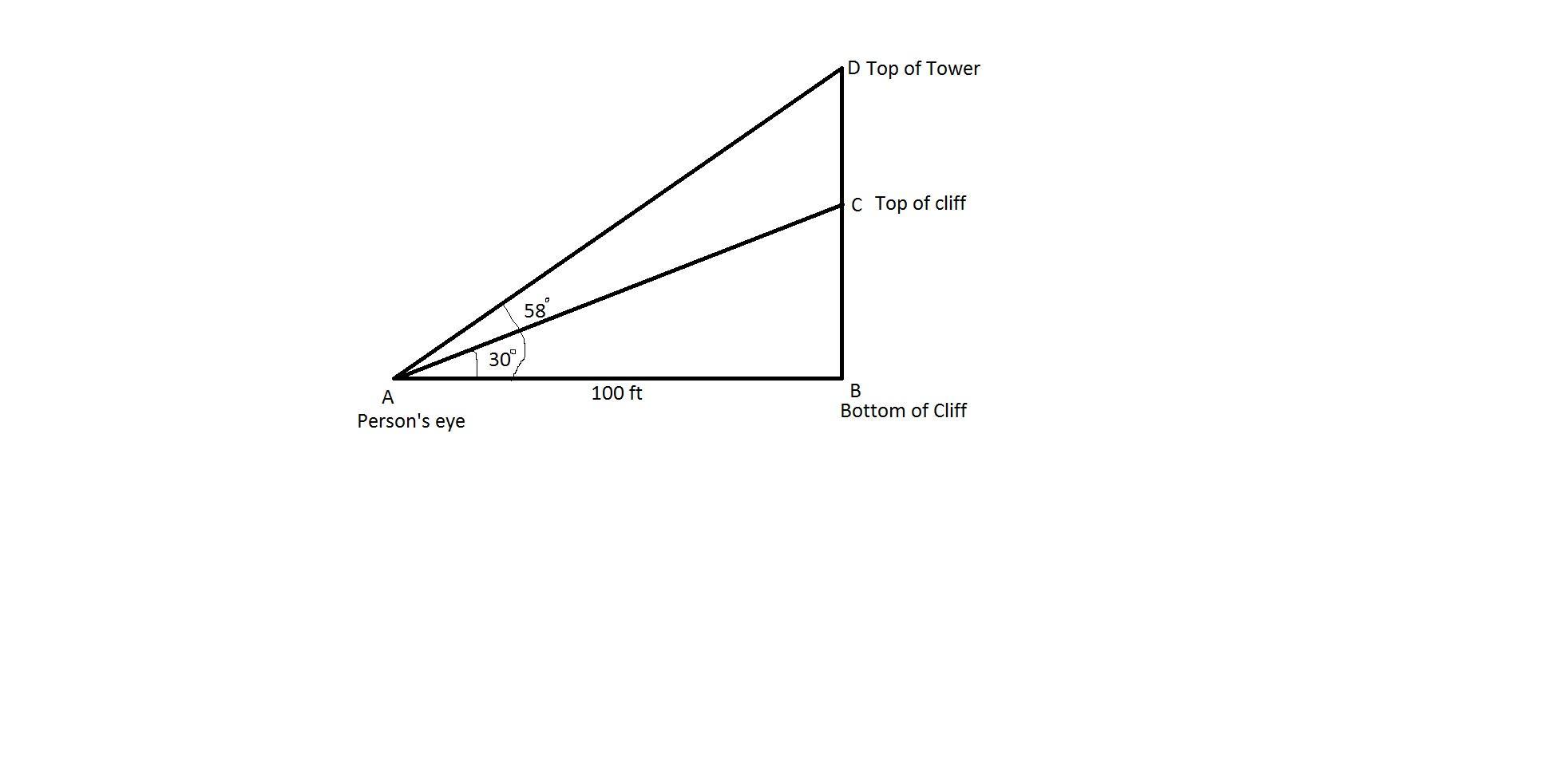 A person standing 100 feet from the bottom of a cliff notices a tower on top of the cliff.