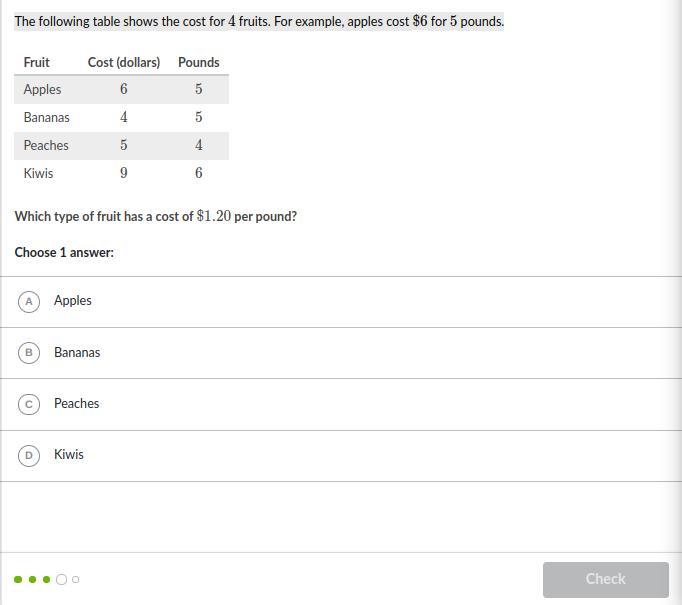 The following table shows the cost for 4 fruits. For example, apples cost $6 for 5 pounds.
