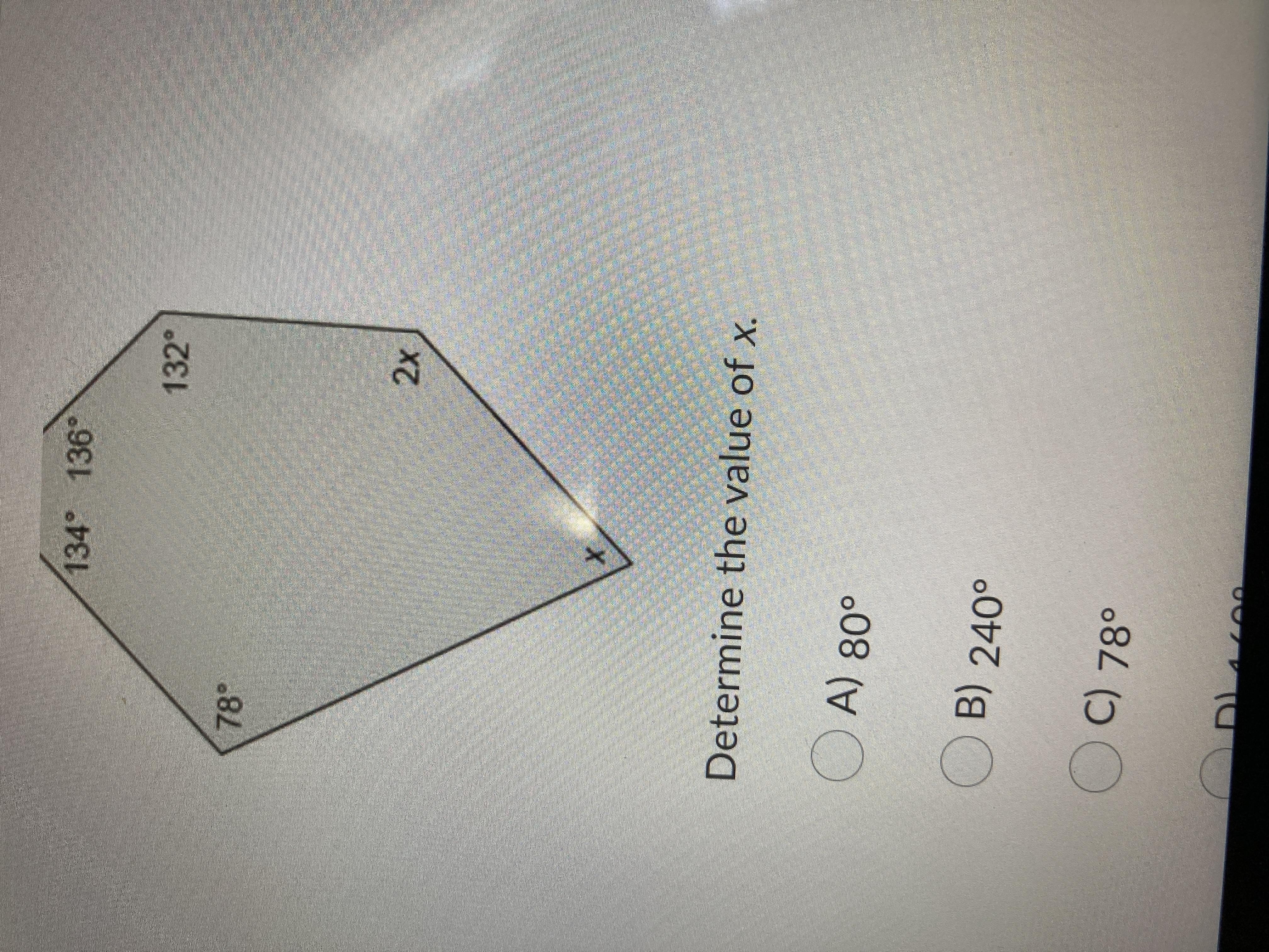 78° + 134 ° + 136 ° + 132 ° + 2x + x = 720°