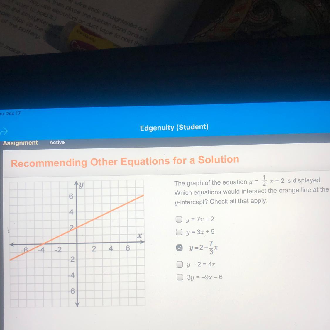 I'm going to write this equation in slope intercept form, which looks like this: y = mx + b. First, write the equation using the slope given. It should look like this: