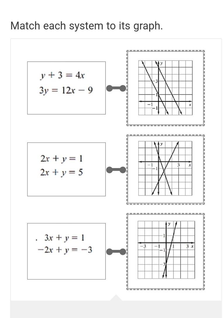For the last system, by elimination, the system matches with the second graph. In this system, you can tell that both the slopes and y-intercepts are different, which means that this equation would actually have one solution, as shown in graph 2.