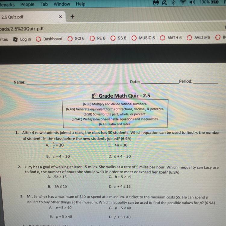 The equation that can be used to find the number of students in the class before new students joined, n, is represented by the equation below: