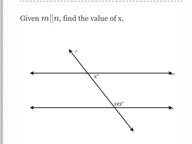 There is a straight line, so that must mean there is a linear pair. We know the first part of that pair is 123 degrees. The linear pair adds up to 180 degrees. Subtract 123 from 180 to get 57.