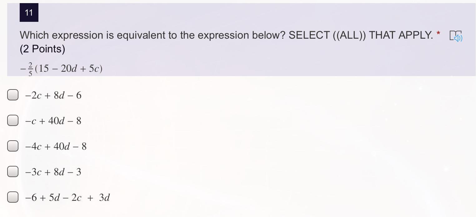 (-\frac{2}{5} × 15) + (-\frac{2}{5} × -20d) + (-\frac{2}{5} × 15c) = (-6) + (8d) + (-2c)
