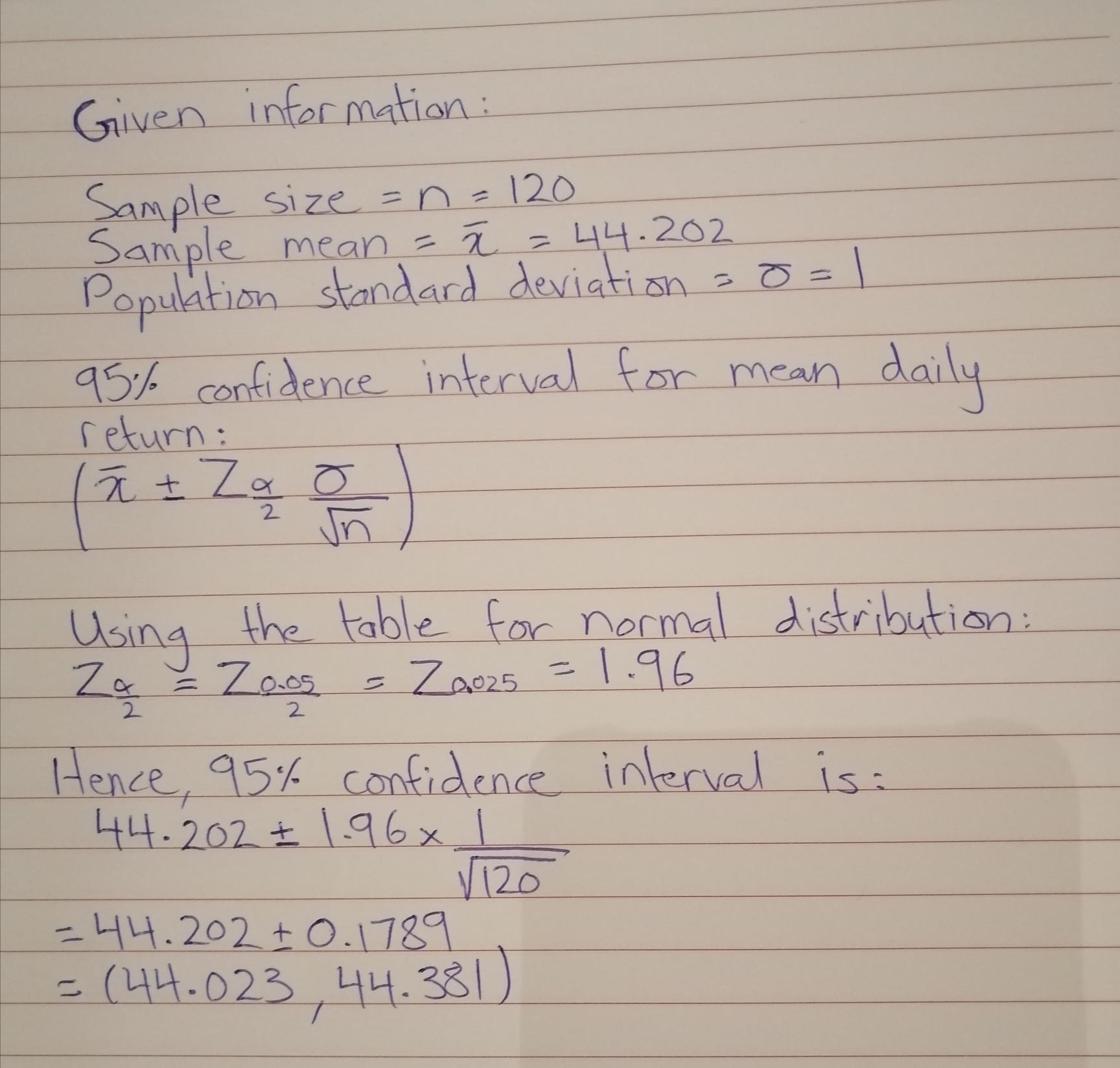 The 95% confidence interval for the mean daily return is (44.023, 44.381).