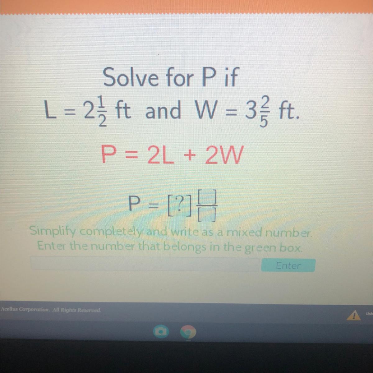 The perimeter as a mixed number is P = 11 & 4/5, but it seems like your teacher only wants the whole part of the answer. So you'll just type 11.