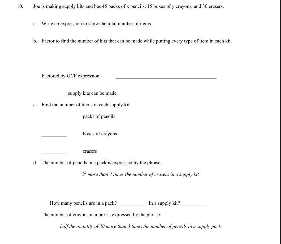A=45 + 15 + 30 = 90 B=15 (for both spaces) C= Pencils=3 boxes a crayons=1 erasers per bag=2 D= 12 pencils in a pack and 3 in a supply kit.
